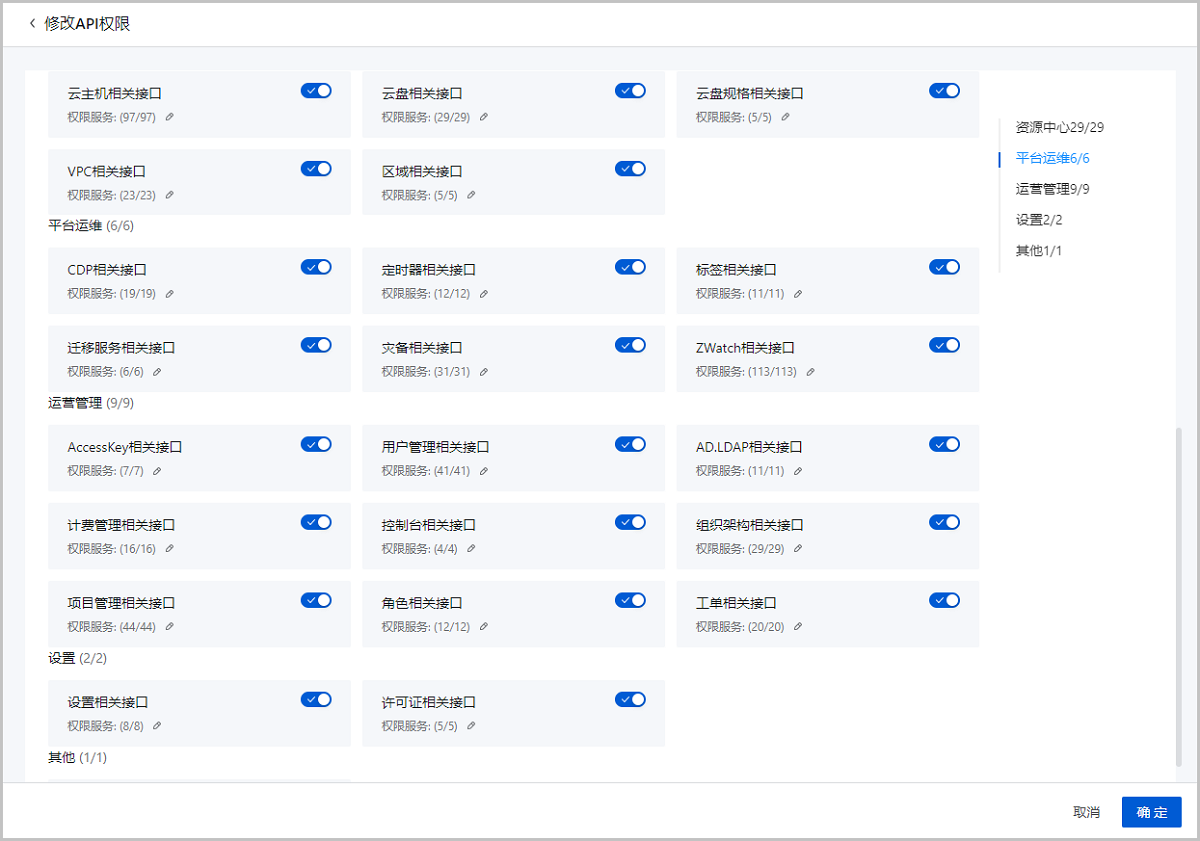 2. 勾选其他服务权限和ZWatch相关接口中的查询获取权限。