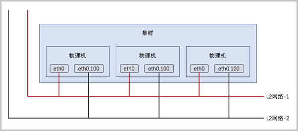 L2NoVlanNetwork是L2网络的基本类型,名字中的NoVlan并不表示不可以使用VLAN技术,它仅仅表示ZStack Cloud不会主动使用VLAN来创建一个二层广播域.。下面两个图例可以帮助理解。