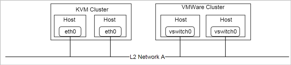 很多看似应用到区域和集群上的操作,实际都被指派到对应的物理主机上了。 当挂载L2网络A到KVM集群和VMware集群的时候, ZStack Cloud必须能够理解在这些集群中虚拟机管理程序是如何使用标记描述L2网络的:在KVM物理主机上eth0代表了L2网络,而在VMware物理主机上vswitch0代表了L2网络。 所以物理接口的名字也反映了不同的虚拟机管理程序。