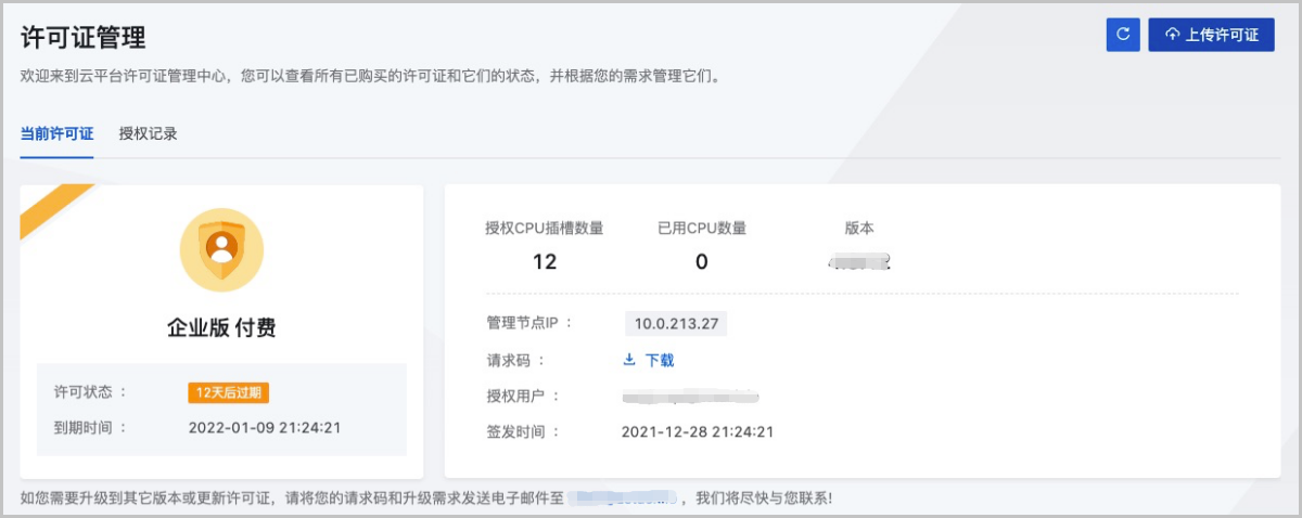| 许可证即将过期 | 当许可证剩余使用期限不足15天时,登录云平台后将出现横幅提示。 说明: