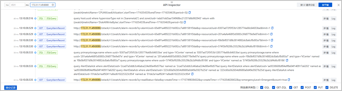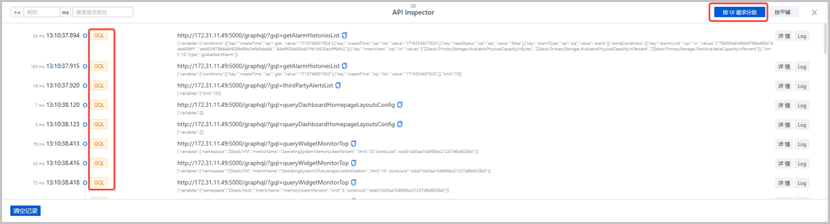 ZStack Cloud 4.8.10版本中,API Inspector增加UI GQL请求信息,并将UI请求和后端请求关联,用户可按UI请求分组,查看一个UI请求及与其关联的一组后端请求,获取更清晰、易读的信息视图。