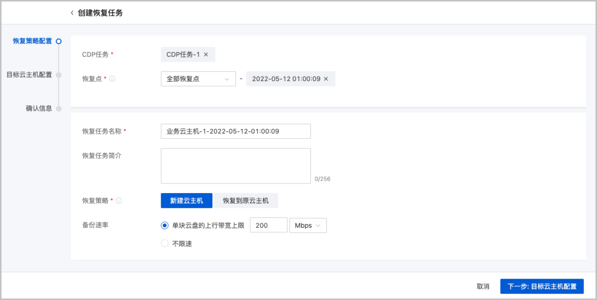 ZStack Cloud 4.4.6开始,新增支持“创建恢复任务”操作,提供向导式的恢复流程。可基于CDP任务和恢复点创建恢复任务,进行数据恢复。