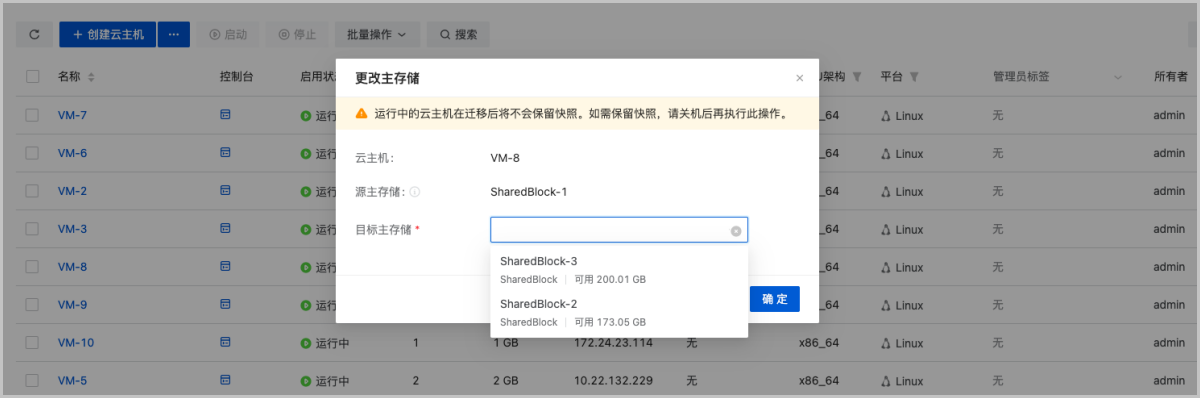 针对“更改主存储”场景,支持将云主机从当前SharedBlock主存储热迁移至其他SharedBlock主存储。此操作仅更改云主机所在主存储,不更改物理机。