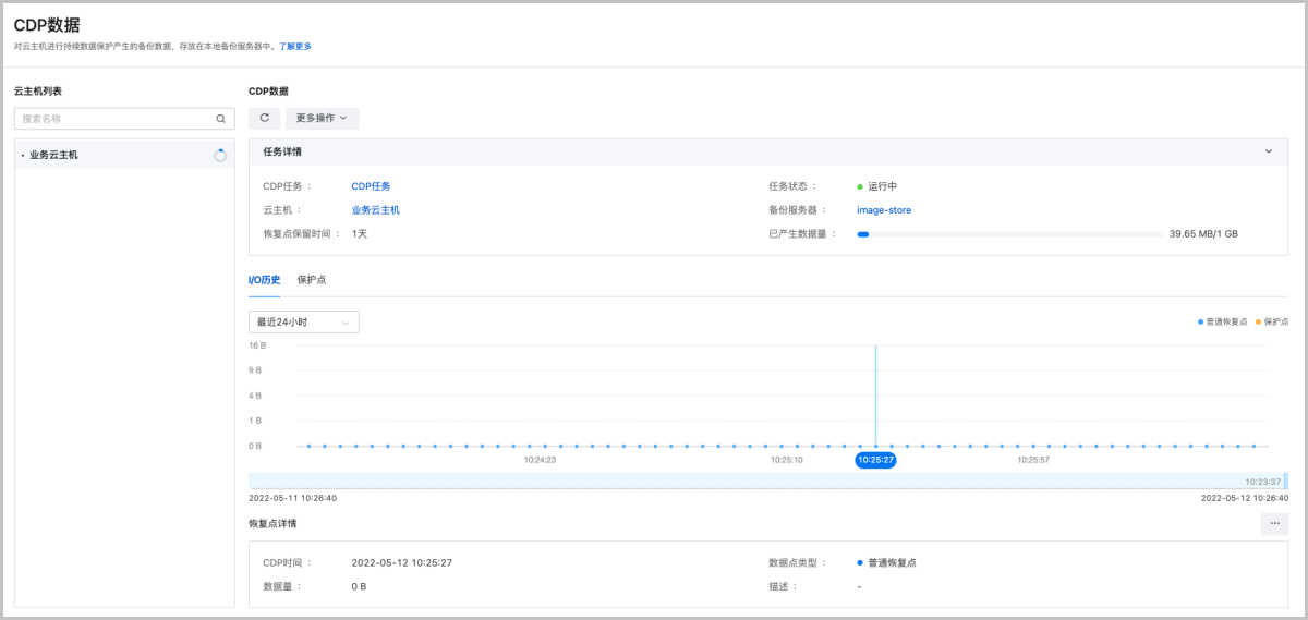在之前版本中,“CDP数据”页面仅提供天粒度的数据展示,数据变化情况不够明显。如需进行数据恢复,需先找到恢复点,再从恢复点操作列表进行恢复。