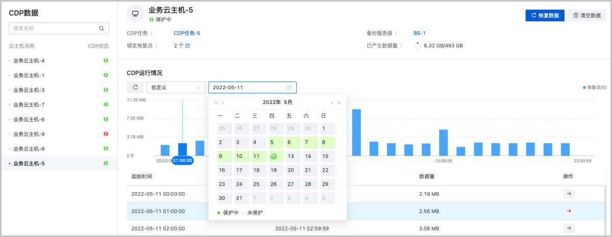 “CDP数据”页面新增提供恢复点搜索日历图,将存在恢复点的日期用绿色进行标识,缩小搜索范围,缩短恢复点查找时间。同时新增“恢复数据”快捷操作入口,方便用户根据已知恢复点快速进行数据恢复。