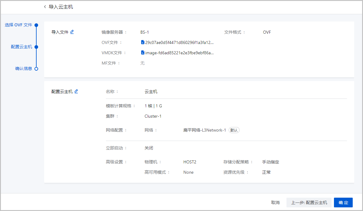 用户从第三方云平台导出云主机OVF模板后,可将OVF模板中的所有格式文件(ovf/vmdk/mf格式)按需导入ZStack Cloud云平台,并按需配置目标云主机的计算、存储、网络相关参数,实现云主机跨平台的高效迁移和灵活部署。