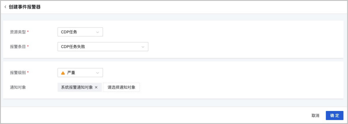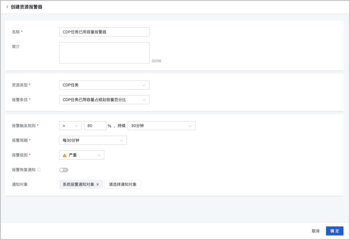 ZStack Cloud 4.3.6新增“默认CDP任务已用容量报警器”,同时支持为CDP任务创建资源报警器和事件报警器,实时监控CDP任务的健康状况并告警,方便运维人员及时响应并定位解决问题。