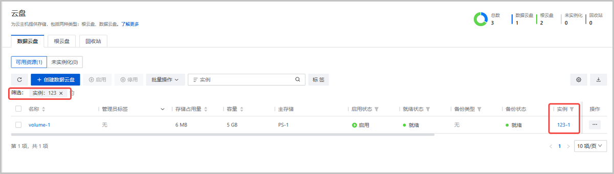 数据云盘列表支持按实例筛选