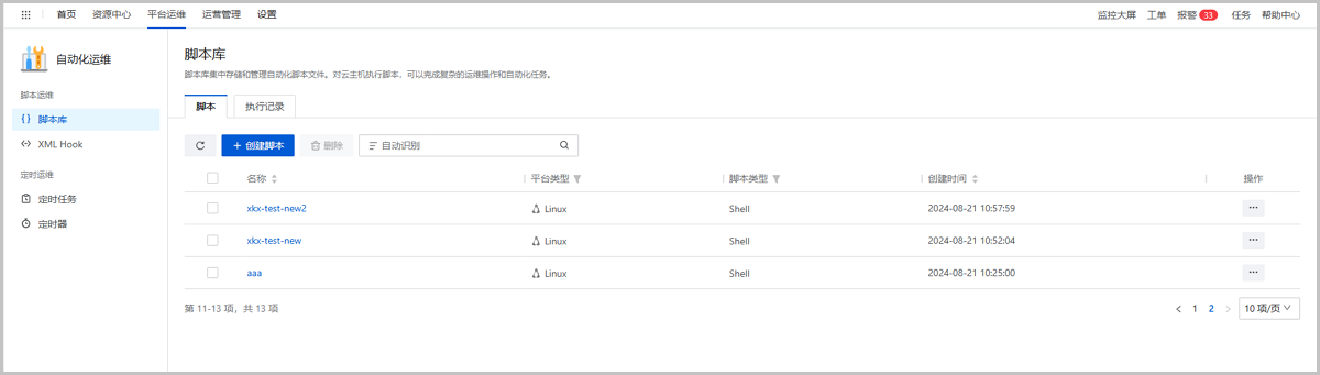 脚本库:脚本库集中存储和管理自动化脚本文件。对云主机执行脚本,可以完成复杂的运维操作和自动化任务。