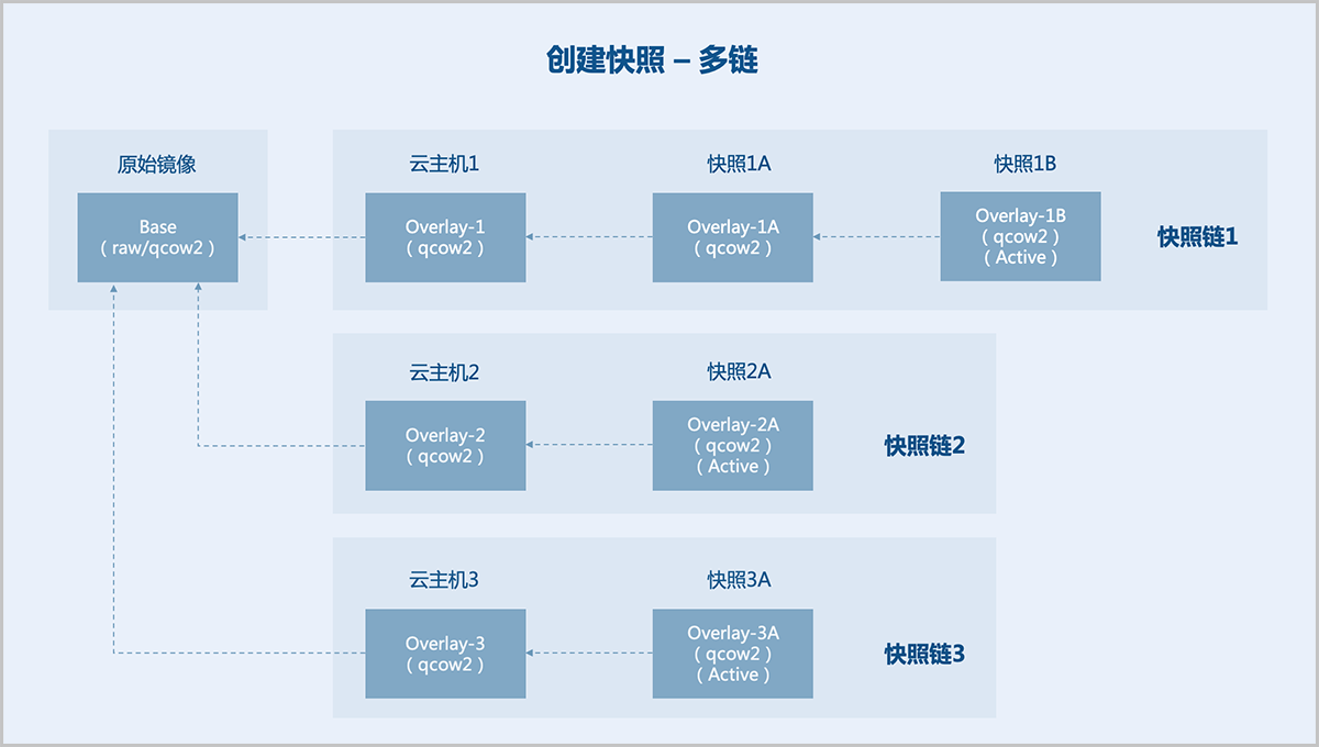 通常一块磁盘对应一条快照链,支持对一块磁盘创建一棵快照树,快照树的每一个分支都是一条快照链。
