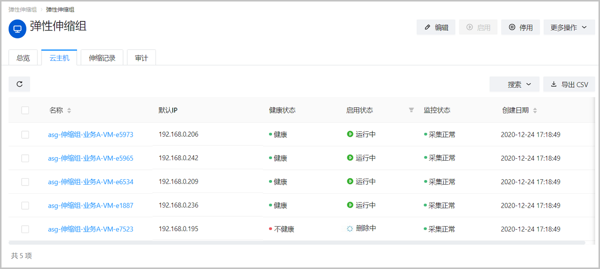 • 弹性自愈:伸缩组处于健康运行的云主机数量持续保持在5台或以上,保障业务正常运作。