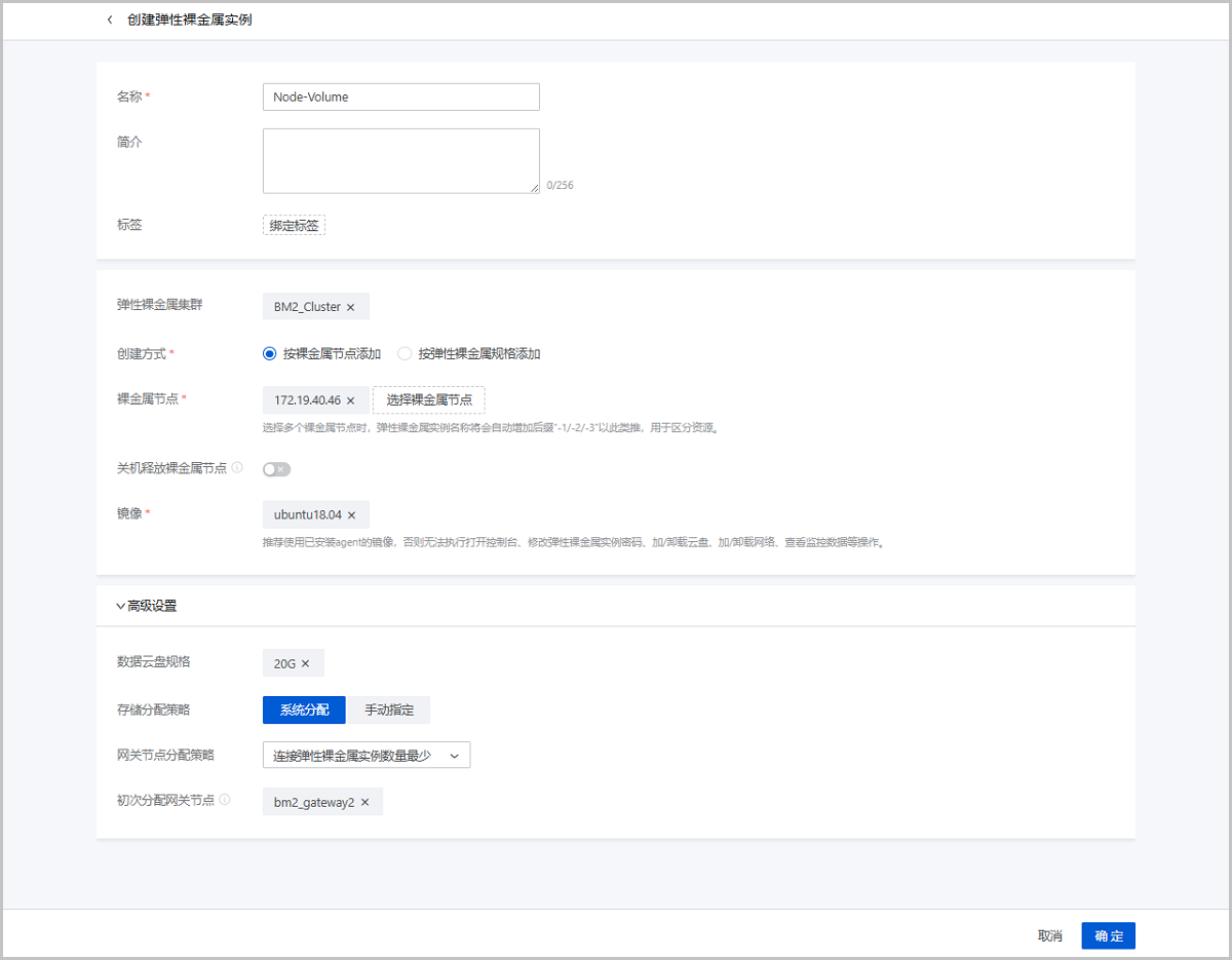 本场景将选择一个启动源为本地磁盘(纳管)的裸金属节点创建弹性裸金属实例,使用裸金属节点的本地磁盘作为弹性裸金属实例的系统盘,并继承裸金属节点的操作系统。