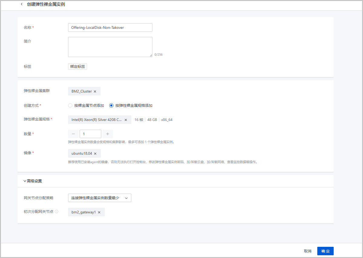 本场景将选择一个启动源为本地磁盘(纳管)的裸金属节点创建弹性裸金属实例,使用对应裸金属节点的本地磁盘作为弹性裸金属实例的系统盘,并继承弹性裸金属规格对应的操作系统。