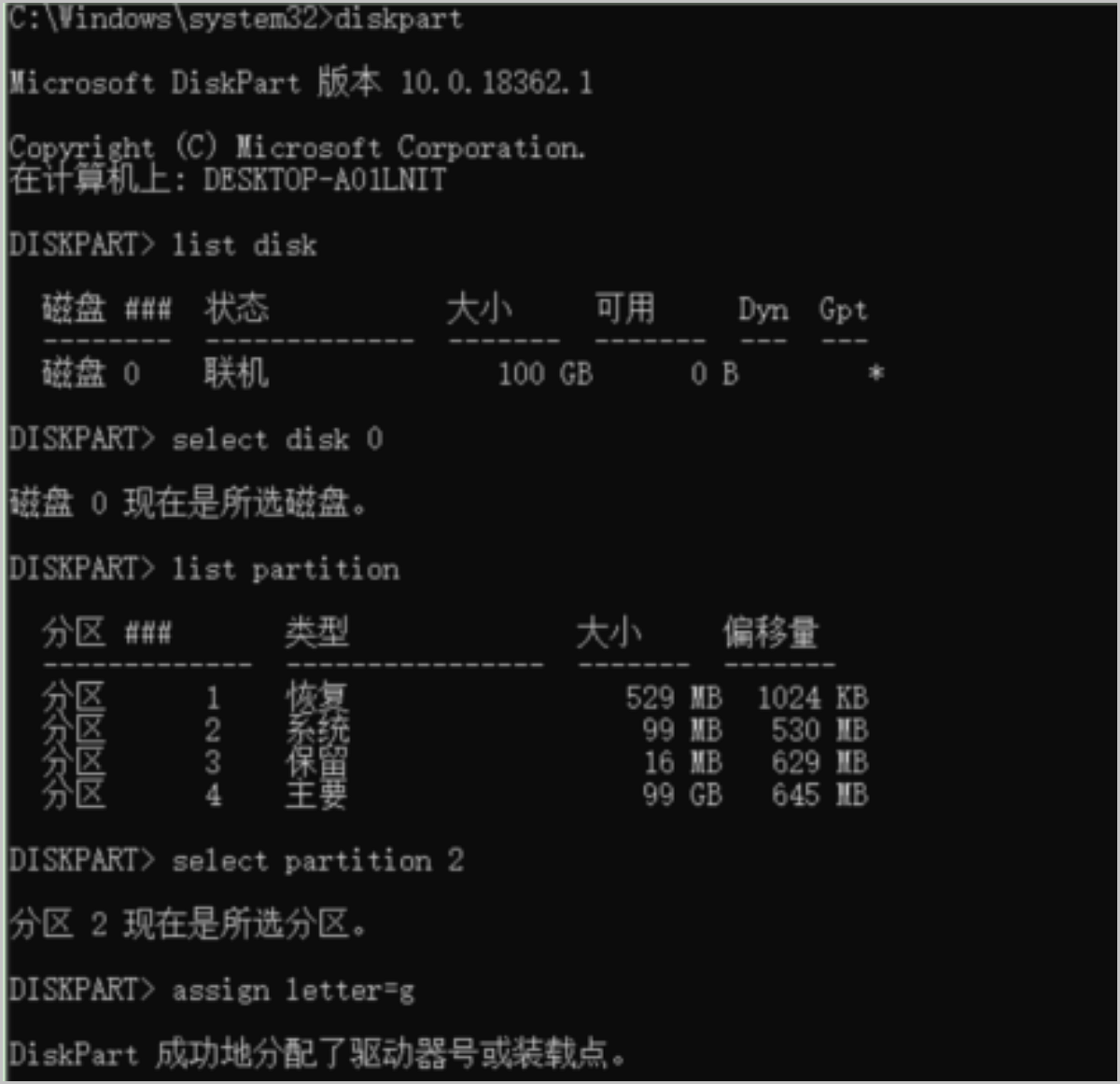 diskpart > list disk //列出磁盘 > select disk 0 //选择第0个磁盘,即系统盘C盘 > list partition //列出分区 > select partition 2 //选择第2个分区,系统EFI分区 > assign letter=g //挂载到卷号g