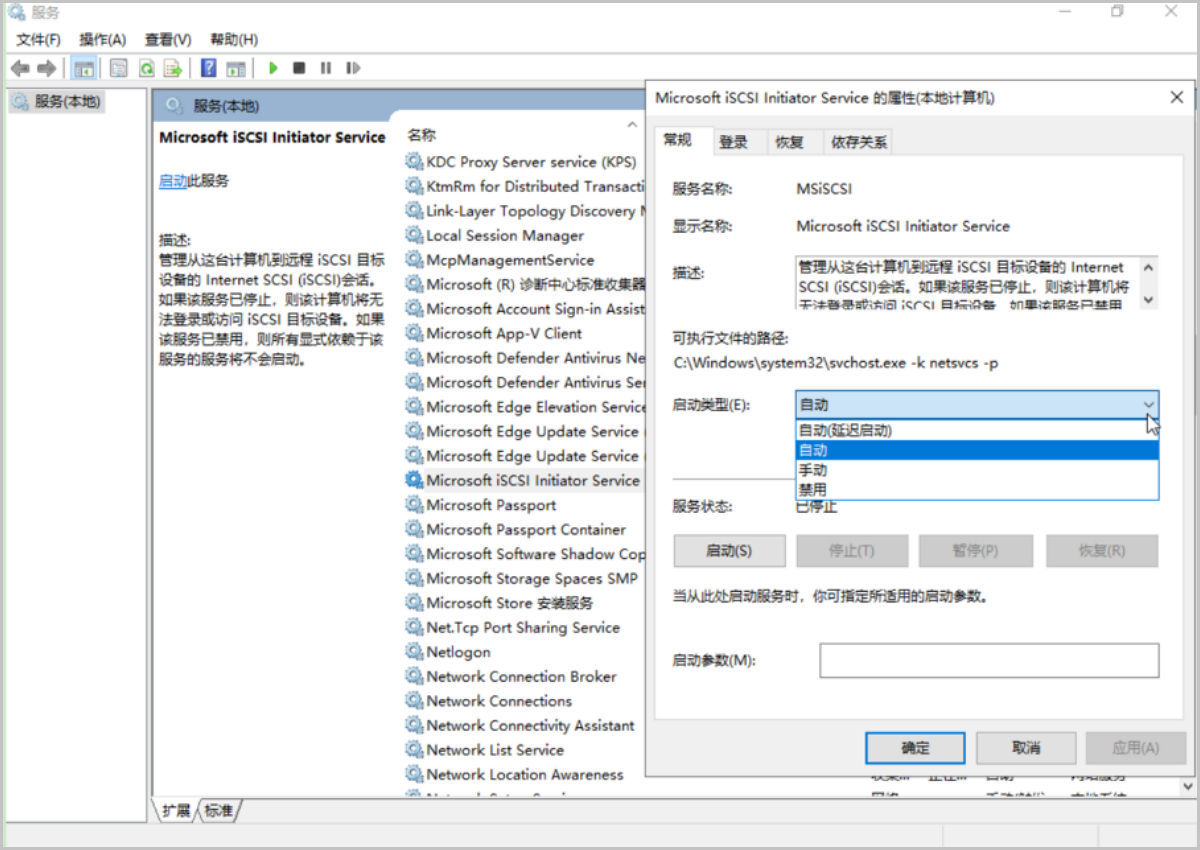 在Windows桌面搜索框中输入服务,打开服务窗口。点击Microsoft iSCSI Initiator Service,弹出Microsoft iSCSI Initiator Service弹窗。点击常规,将启动类型设置为自动。