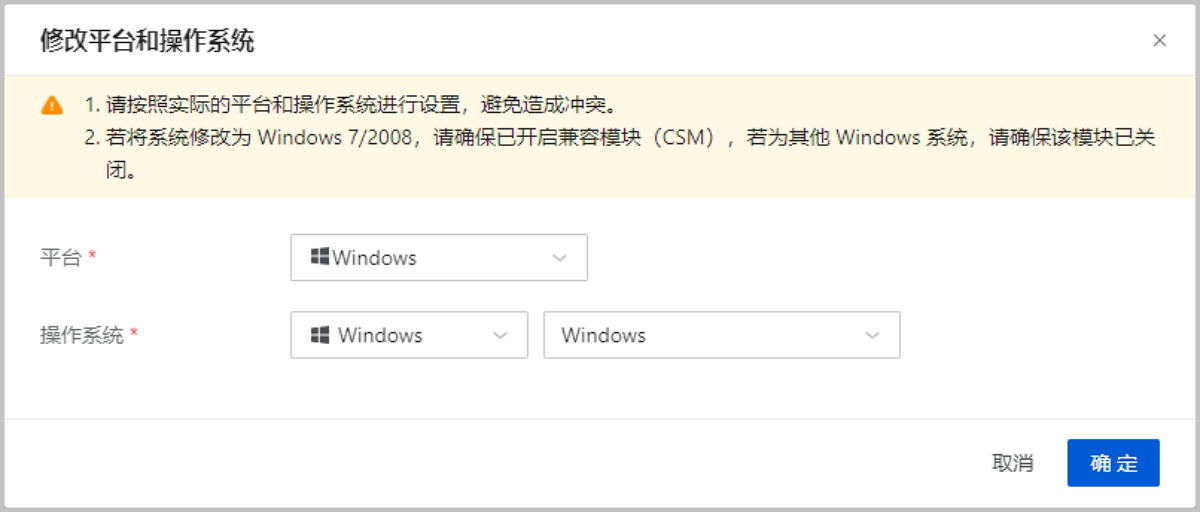 1. 登录云平台,点击资源中心 > 云资源池 > 虚拟资源 > 云主机,进入云主机界面。选择故障云主机,在该云主机详情页的基本信息中,点击编辑平台和操作系统,弹出修改平台和操作系统界面,确认云主机类型为Windows云主机。