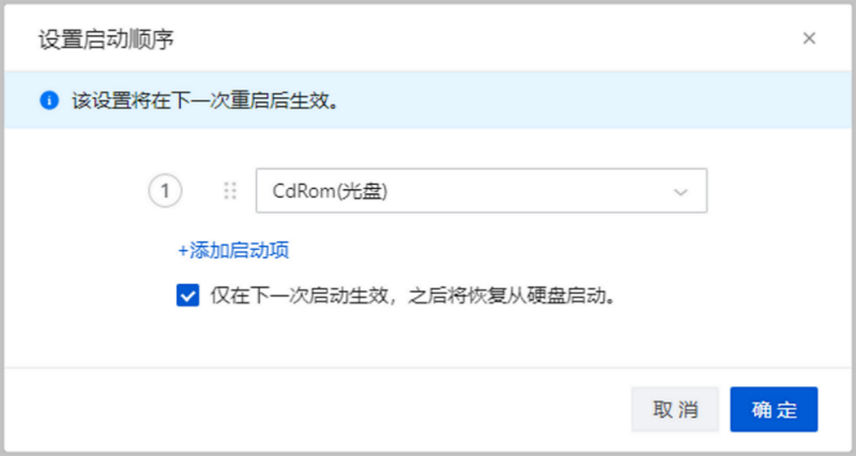 3. 点击更多操作 > 系统配置 > 设置启动顺序,弹出设置启动顺序界面。将云主机启动顺序设置为CdRom (光盘)启动,并勾选仅在下一次启动生效,之后将恢复从硬盘启动选项。