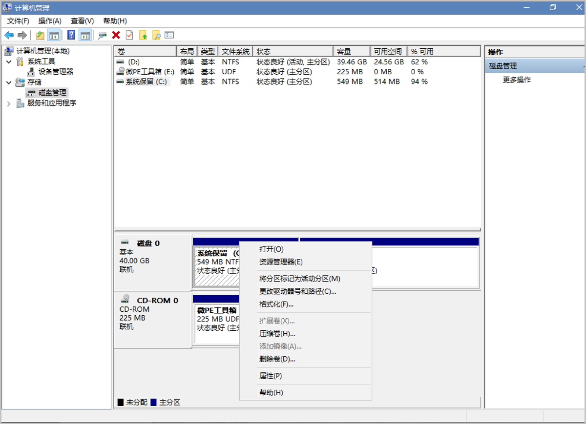 4. 重启云主机进入PE系统,打开计算机管理界面,点击计算机管理 (本地) > 存储 > 磁盘管理,进入磁盘管理界面。右键点击系统保留分区,选择将分区标记为活动分区,修改后重启云主机,系统恢复。