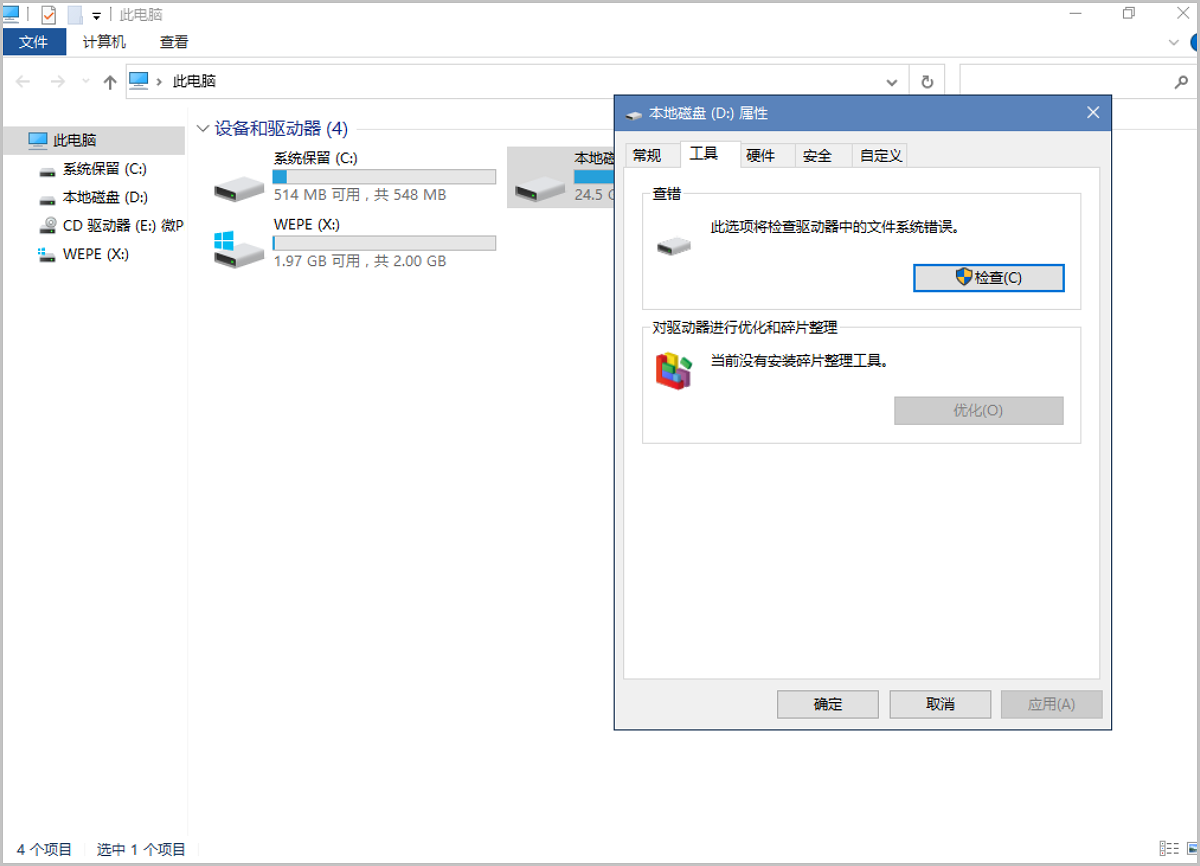 4. 重启云主机进入PE系统,打开此电脑界面,选中磁盘后右键点击属性,弹出磁盘属性界面,点击工具 > 检查,启动Windows磁盘修复。