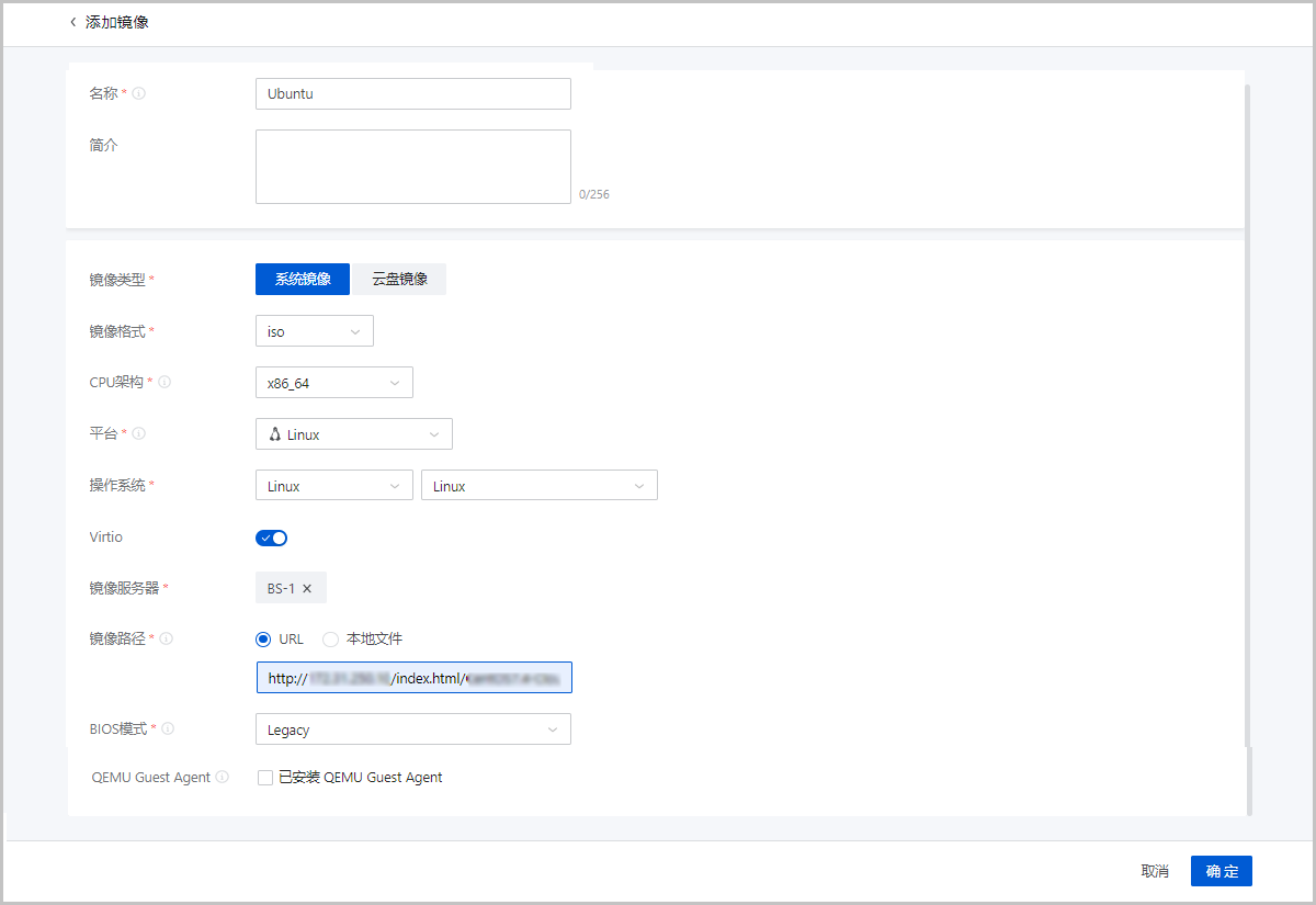 • 输入URL时,需确保可被镜像服务器访问,且存在此镜像文件。