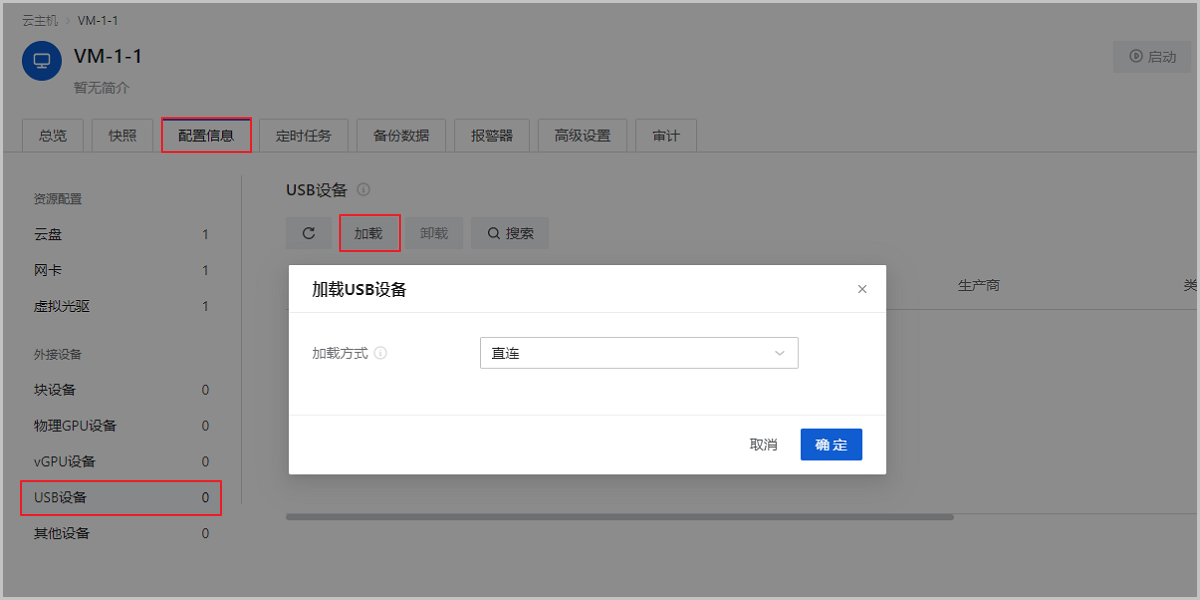 • 直连:将此云主机所在物理机上的USB设备加载到云主机,迁移云主机时需要卸载此USB设备。