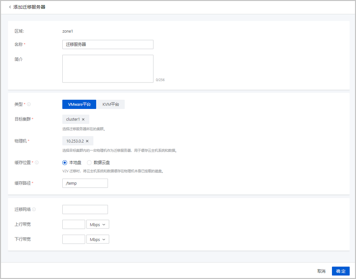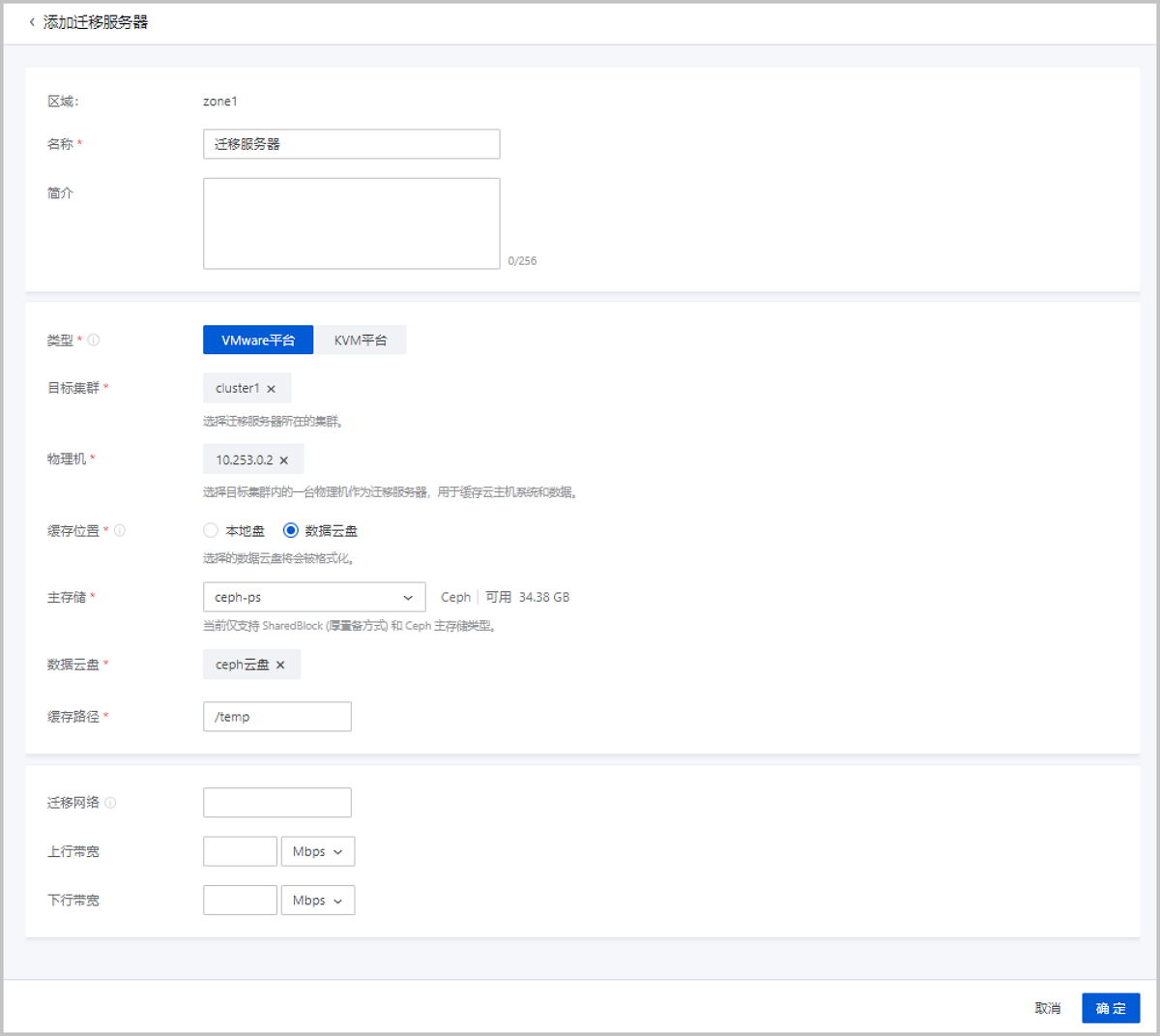设置网络带宽 | 设置迁移服务器的上行/下行带宽。 |