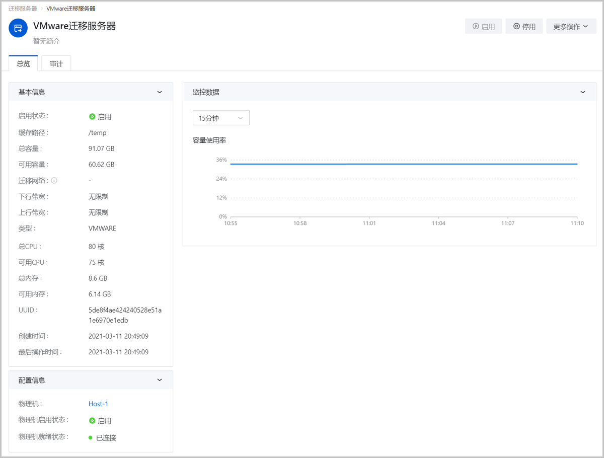 停用迁移服务器 | 将已启用的迁移服务器停用。 说明: 若在V2V迁移任务执行过程中将迁移服务器停用,迁移任务不受影响。 |