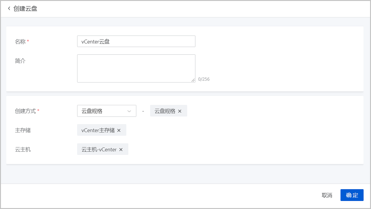 创建vCenter云盘 | 基于云盘规格或云盘镜像创建一个新的vCenter云盘。 |