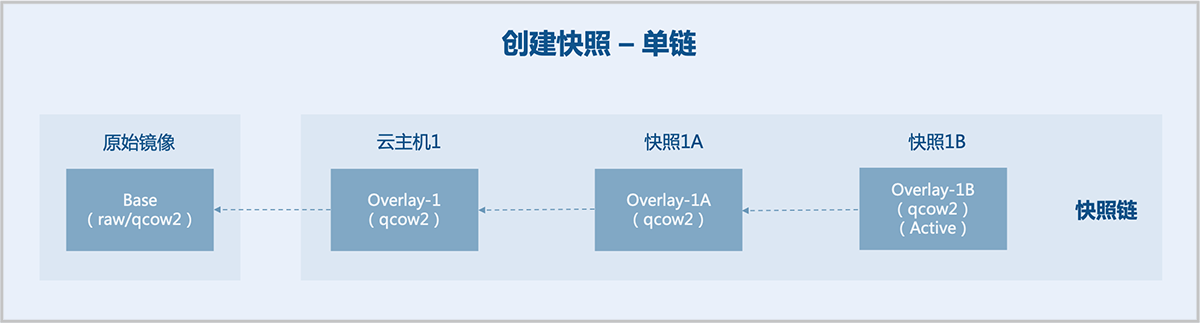 • 快照1B:新建空白文件Overlay-1B,backing file指向Overlay-1A,Overlay-1A置为只读,于是Overlay-1A成为一个快照,后续只对Overlay-1B写入数据。云主机1使用的是快照链1内最后一个快照1B对应的磁盘文件,快照1B为Active。