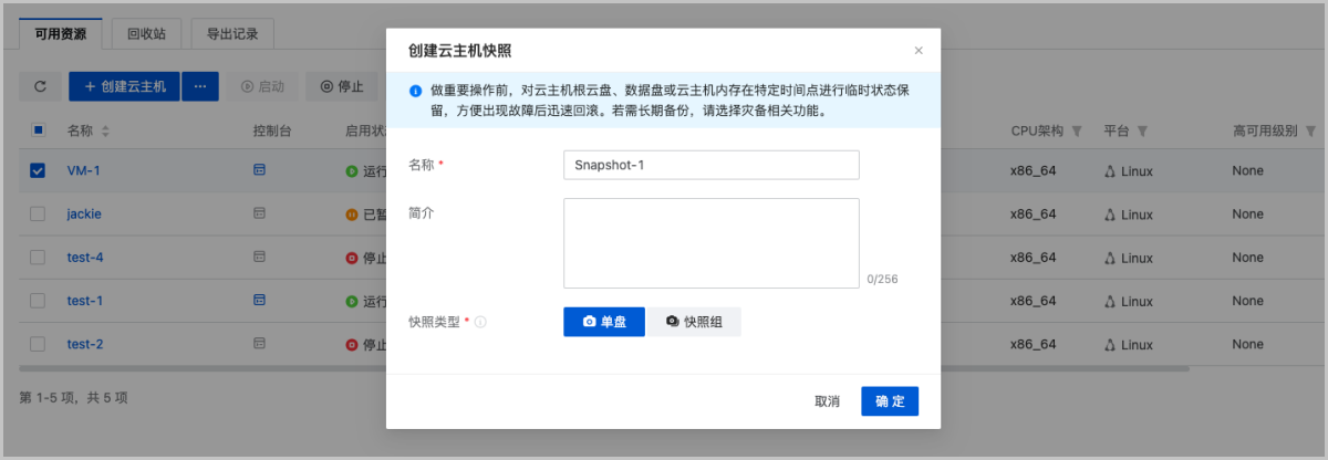 在ZStack Cloud主菜单,点击,进入云主机界面。选择某一云主机(运行中/已暂停/已停止),执行创建快照操作。