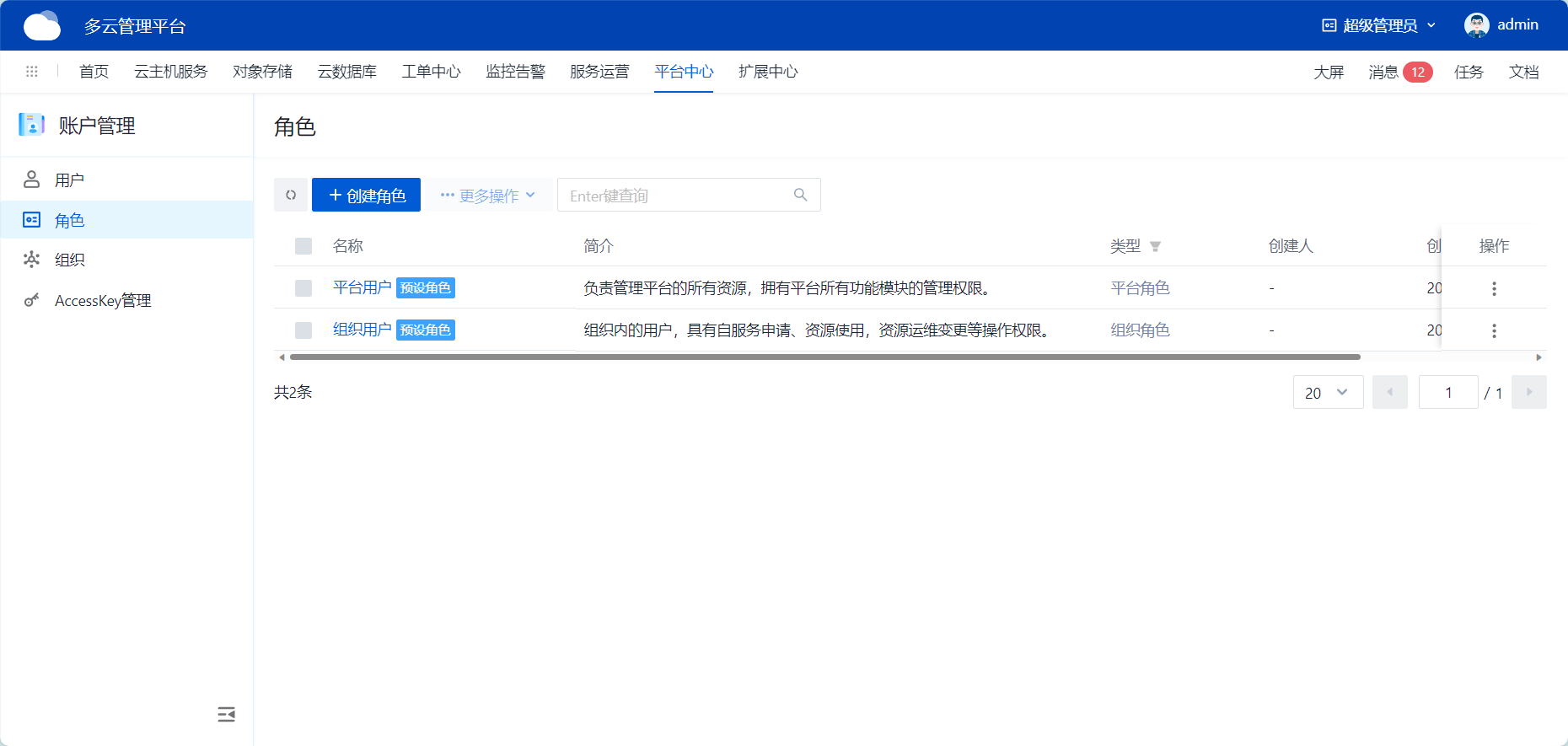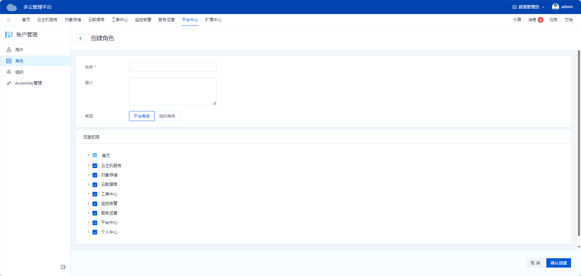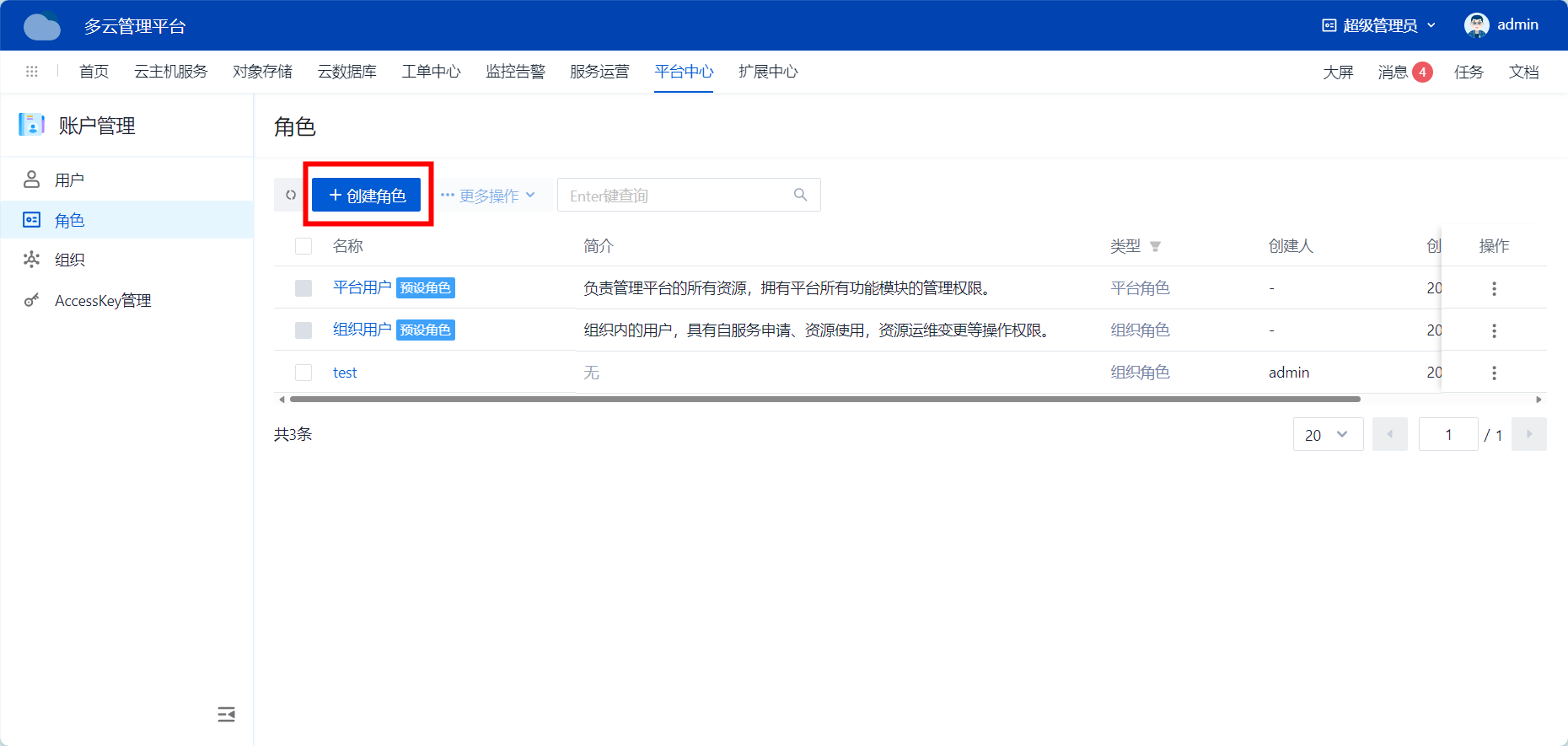 在平台中心>>账户管理>>角色页面点击【创建角色】按钮。