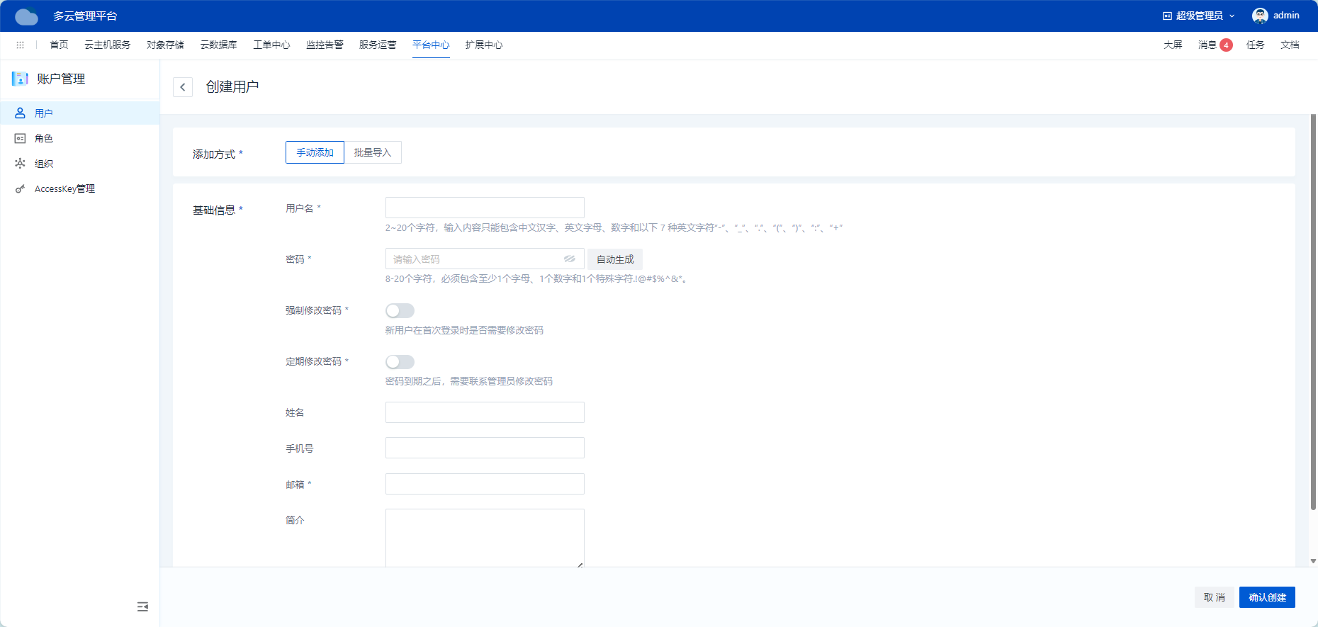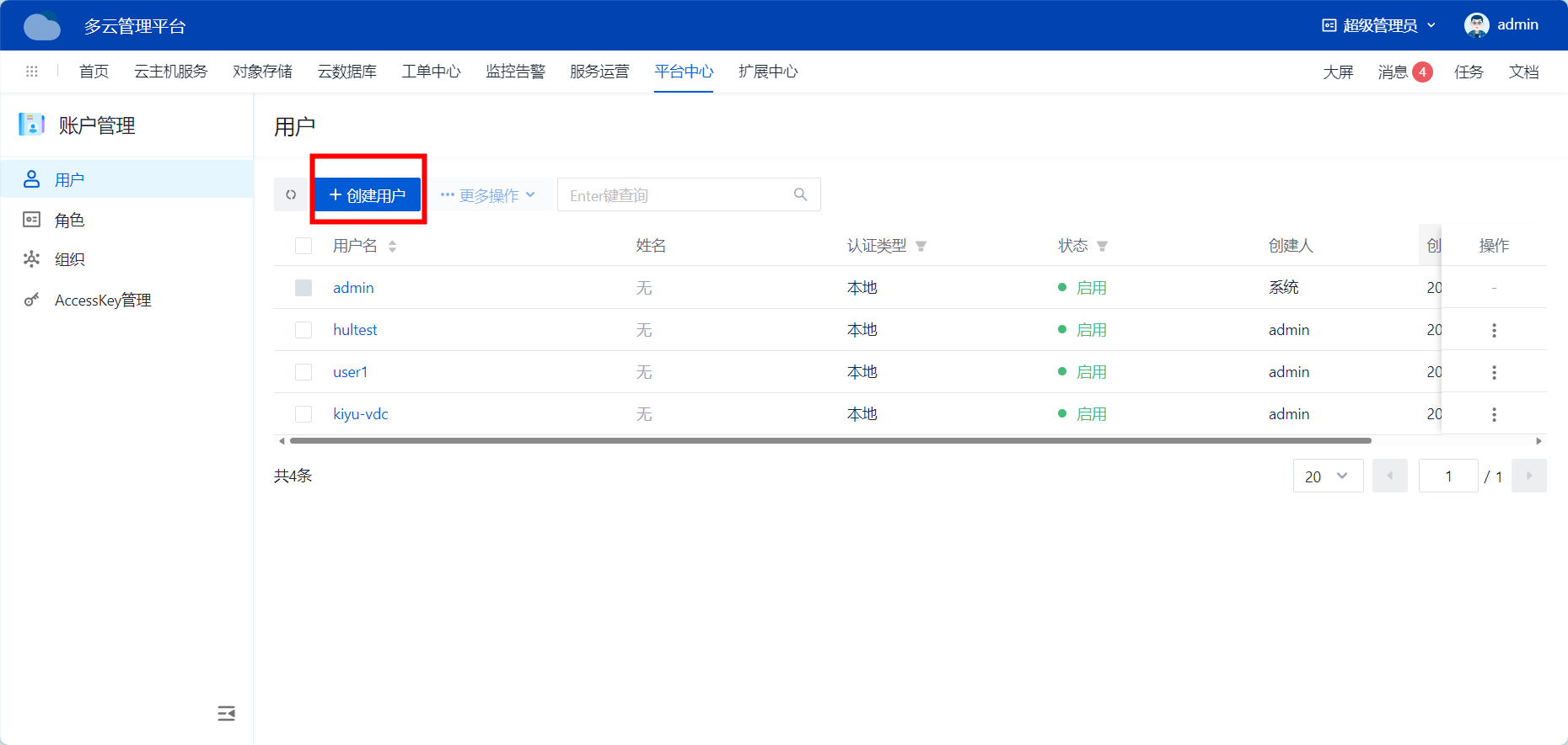 在平台中心>>账户管理>>用户页面点击【创建用户】按钮。