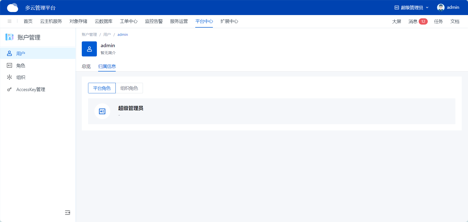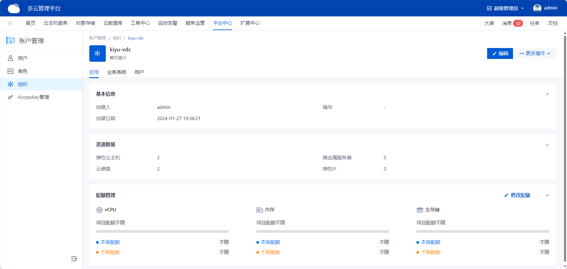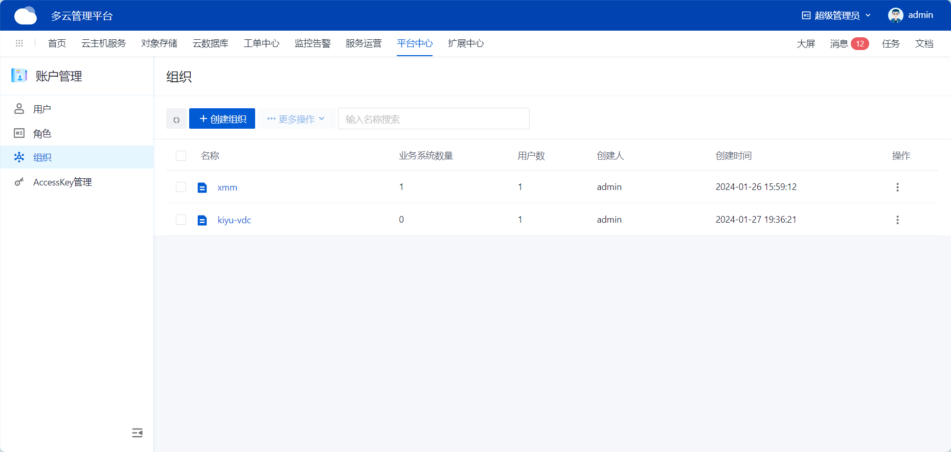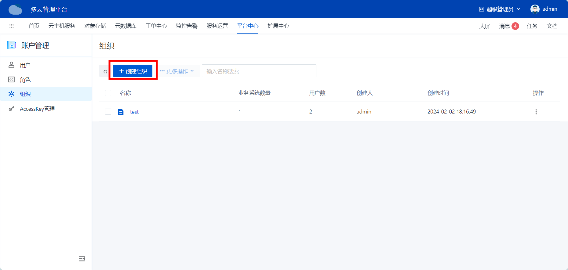 创建组织完成后,点击平台中心>>账户管理>>组织页面,查看创建完成的组织并进入详情页。