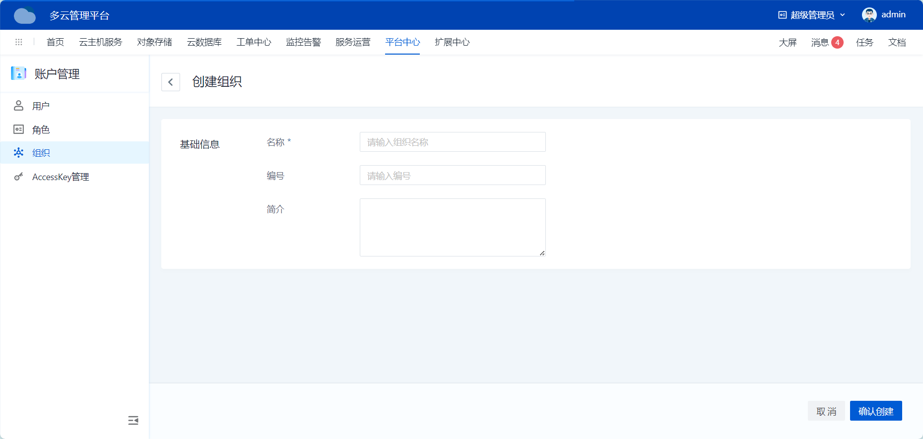 用户在平台中心>>账户管理>>组织页面点击【创建组织】按钮。