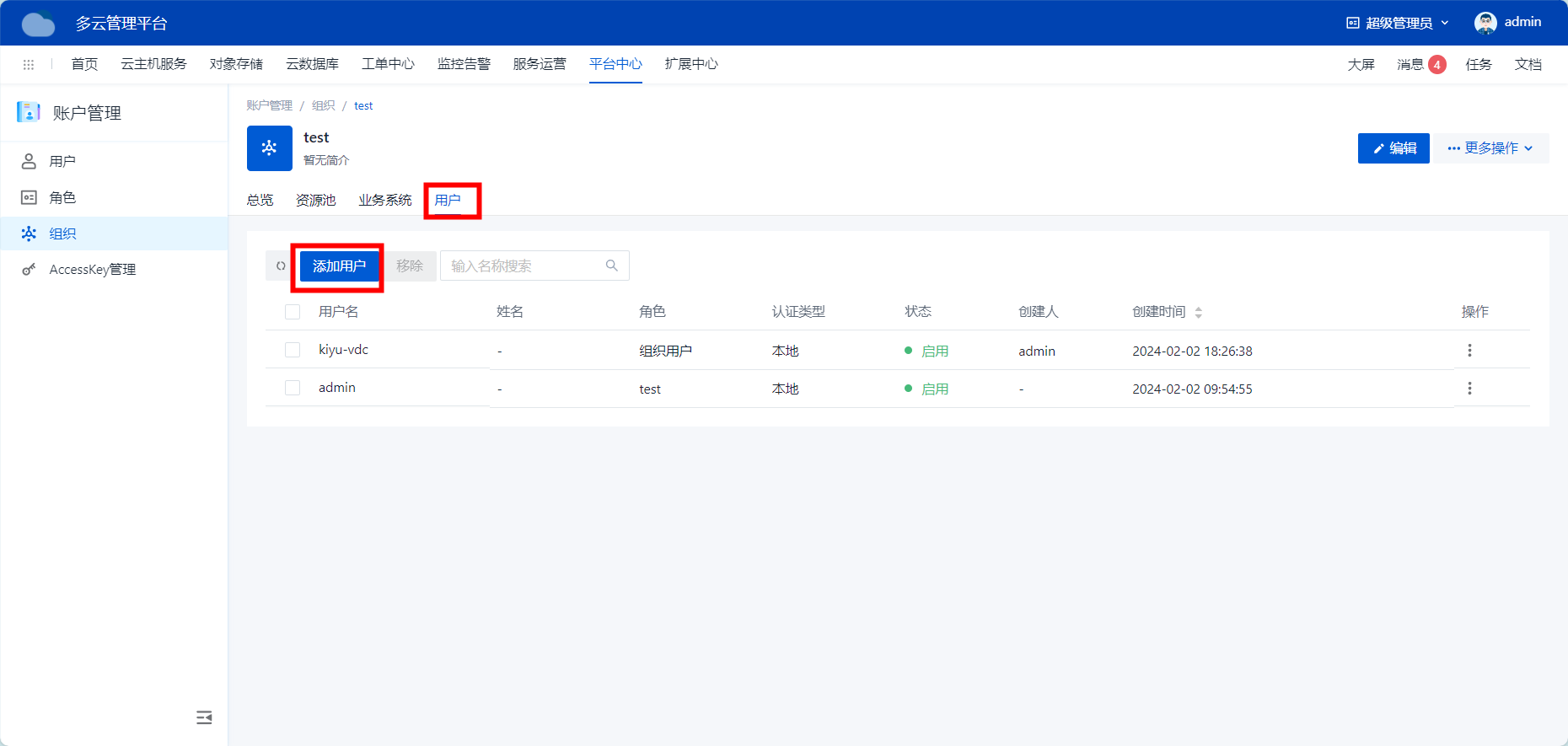 创建完成的组织中,需要添加用户与角色,形成完成的用户体系流程。