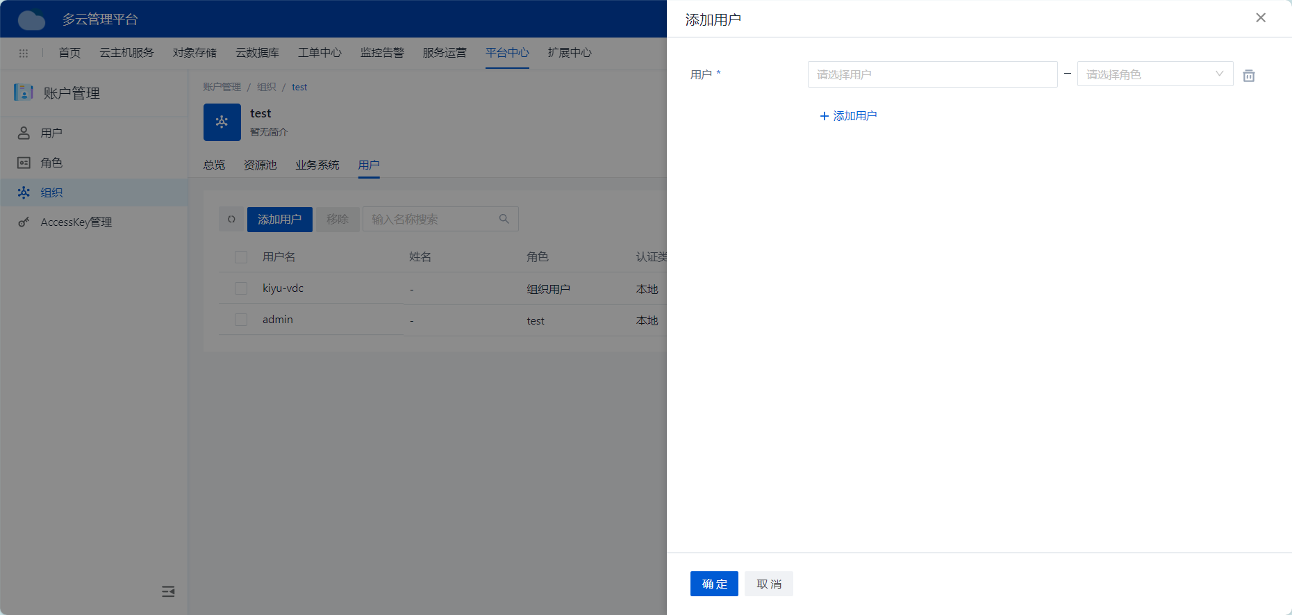 选择创建完成的用户及其角色信息,完成用户、角色的绑定并添加至组织。