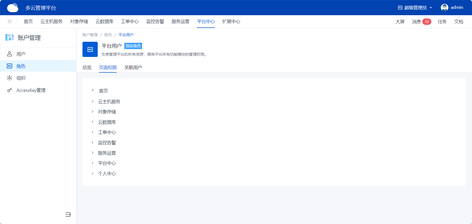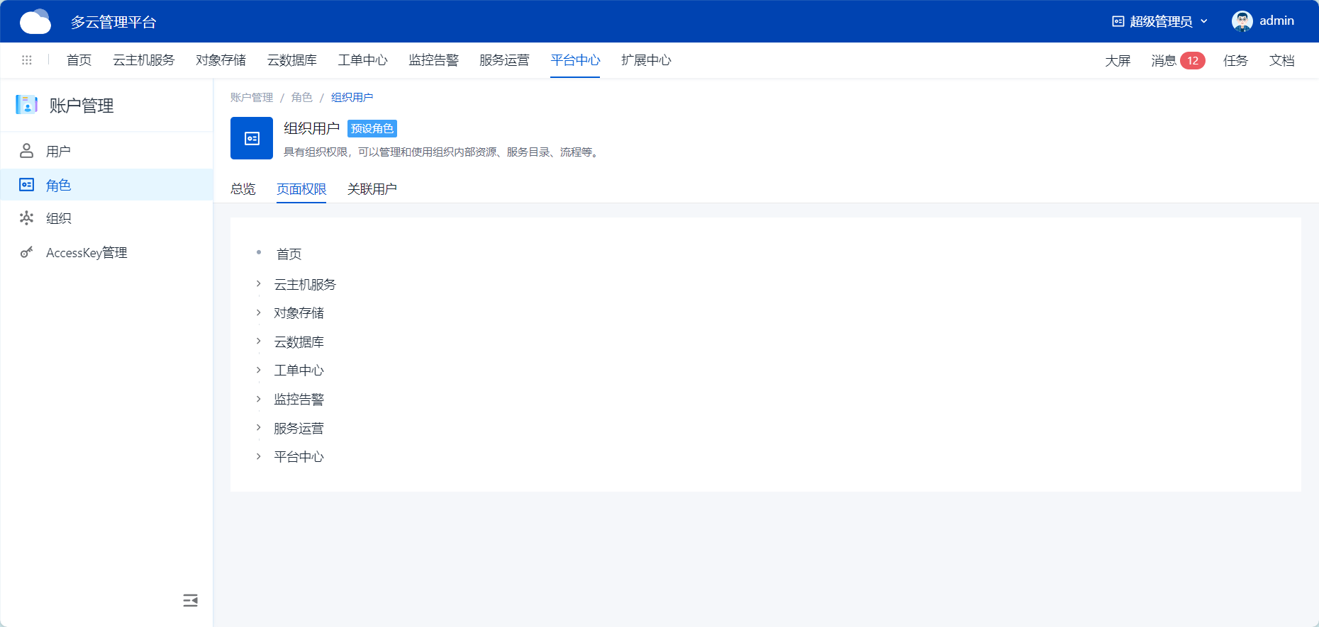 不同角色类型拥有的角色权限不一致,平台角色拥有查看全局菜单及功能的权限,组织角色无管理员关联的菜单及功能权限。