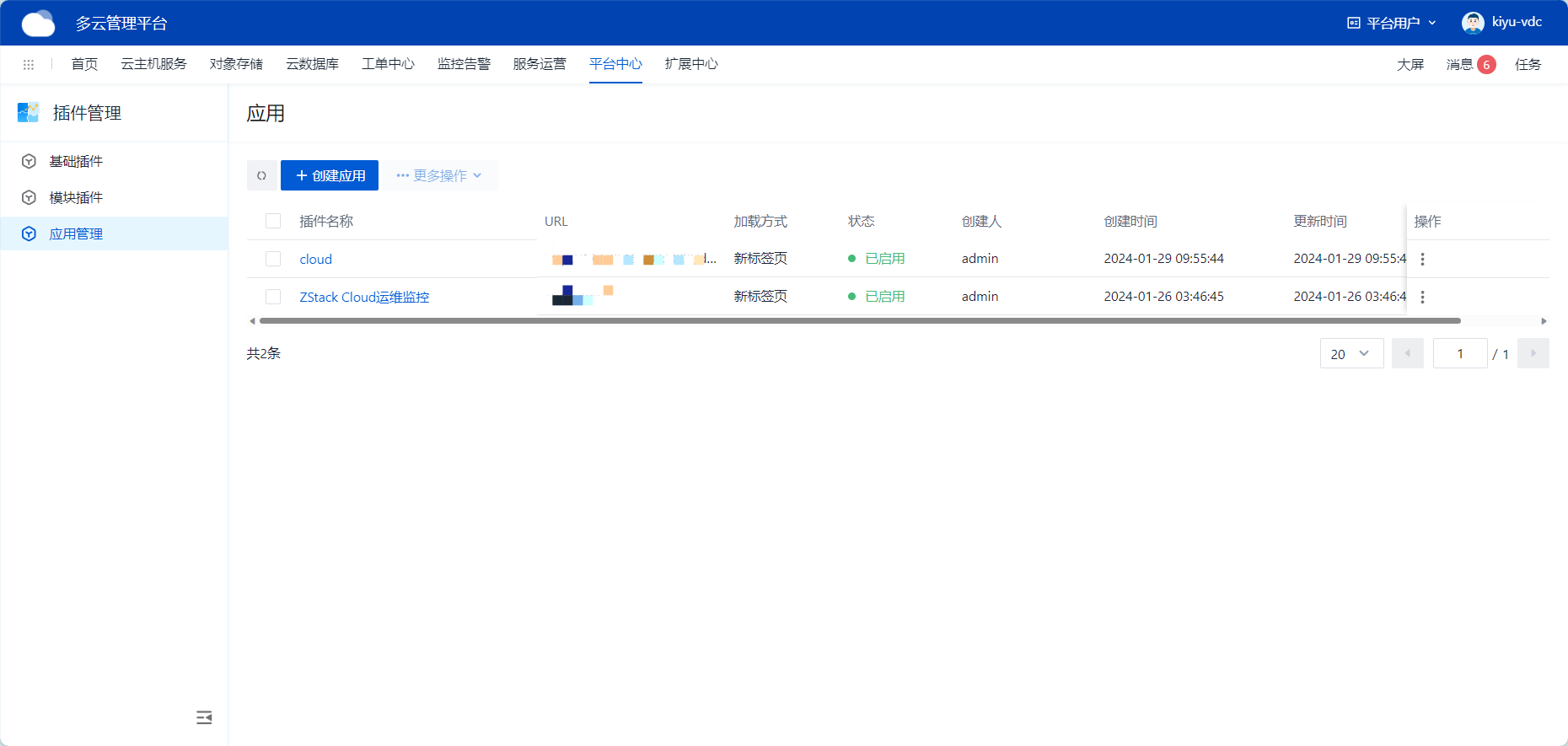 管理员在平台中心>>插件管理>>应用管理页面中,点击【创建应用】按钮可添加自定义插件可用于第三方网页跳转,用户通过创建自定义插件可实现在ZStack CMP中插入第三方iframe,通过点击iframe可自动跳转至第三方页面。