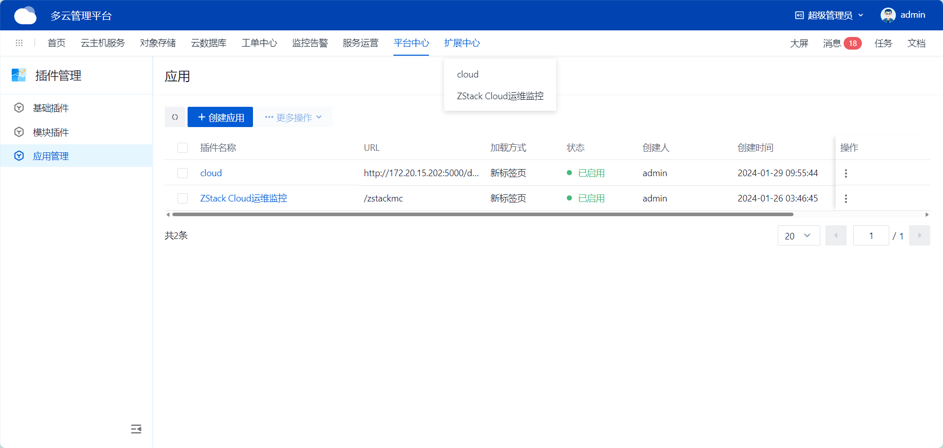 管理员在平台中心>>插件管理>>应用管理页面中,点击【创建应用】按钮可添加自定义插件可用于第三方网页跳转,用户通过创建自定义插件可实现在ZStack CMP中插入第三方iframe,通过点击iframe可自动跳转至第三方页面。