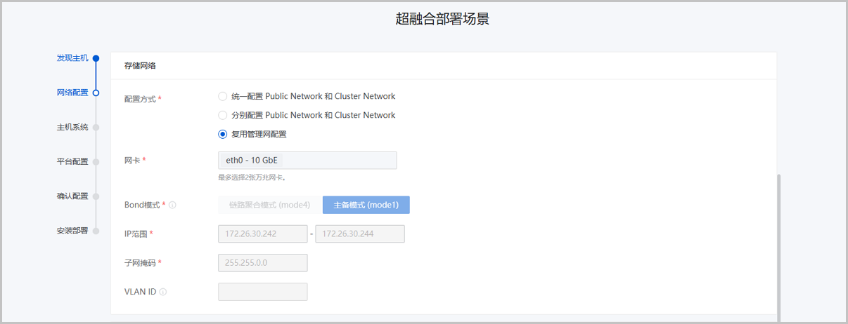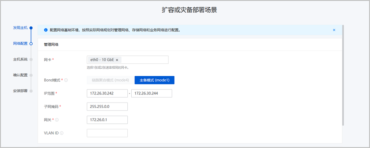 配置网络基础环境,按照实际网络规划对管理网络、存储网络、业务网络和BMC网络进行配置。