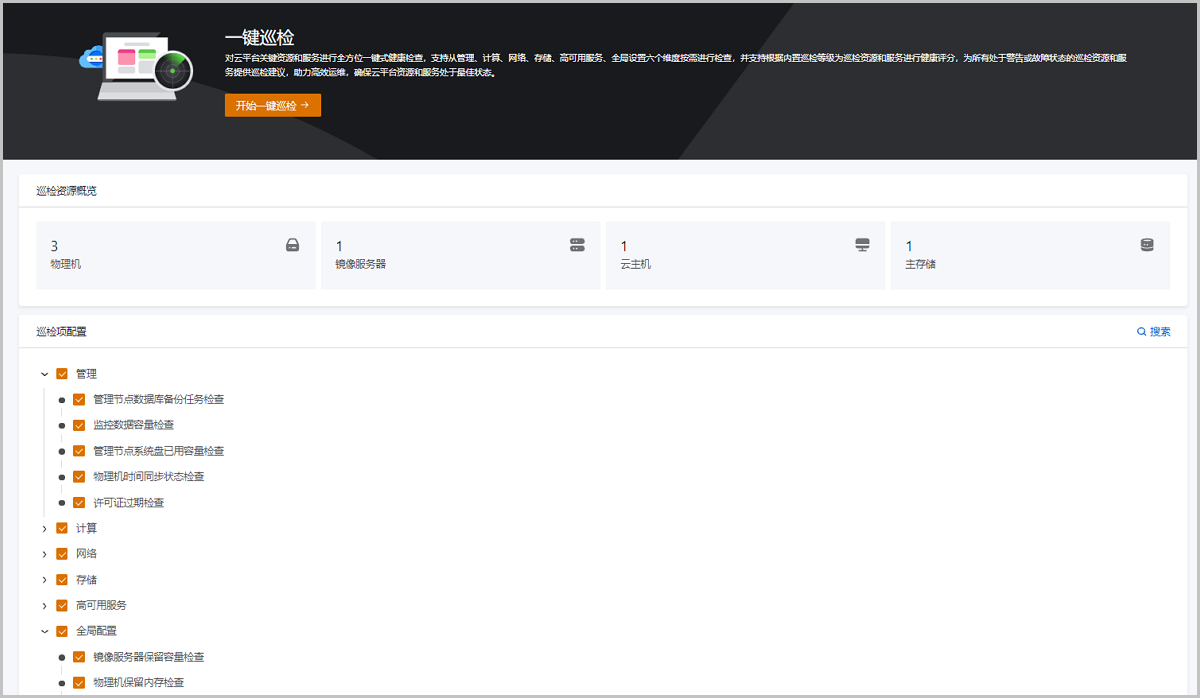 | 开始一键巡检 | 自定义选择巡检项后,对所选巡检项进行一键巡检。 | / |