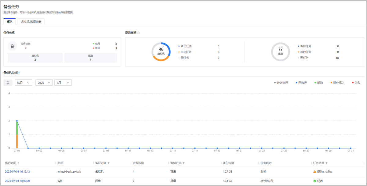 备份任务概览页通过可视化视图直观展示当前平台核心资源备份任务统计、资源统计,以及执行情况统计。
