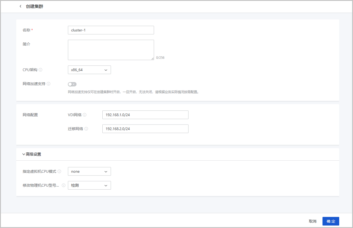 在ZStack Cube 双引擎版主菜单,点击,进入集群界面。点击创建集群,弹出创建集群界面。