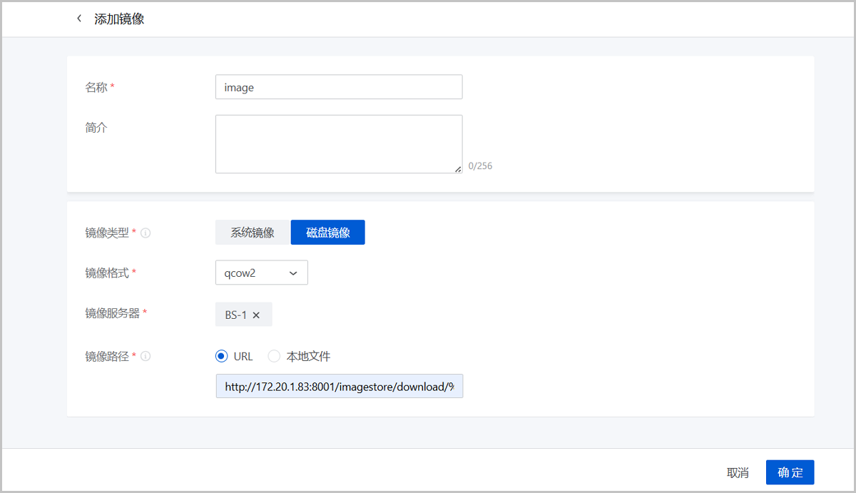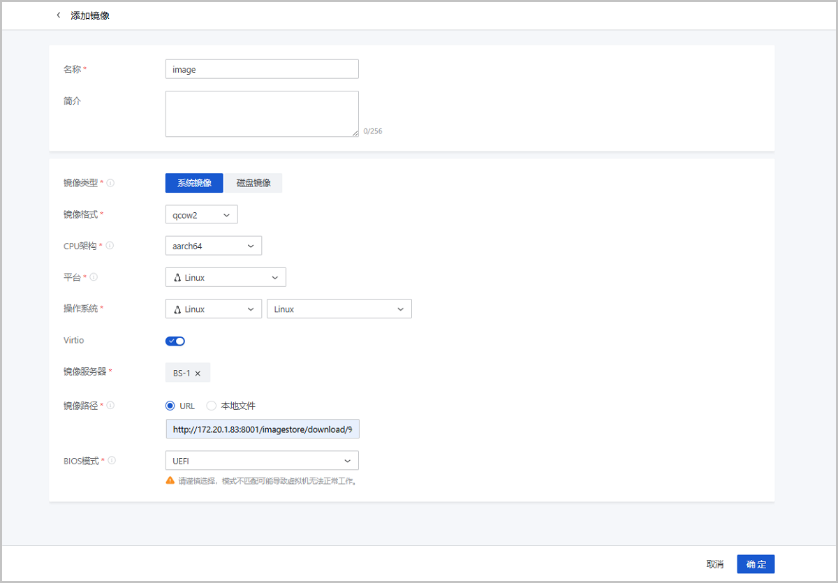 在ZStack Cube 双引擎版主菜单,点击,进入虚拟机镜像界面。点击添加镜像,弹出添加镜像界面。