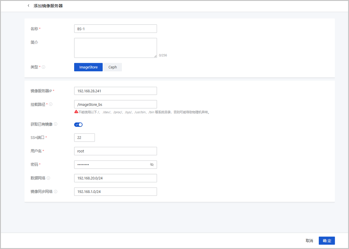 在ZStack Cube 双引擎版主菜单,点击,进入镜像服务器界面。点击添加镜像服务器,弹出添加镜像服务器界面。