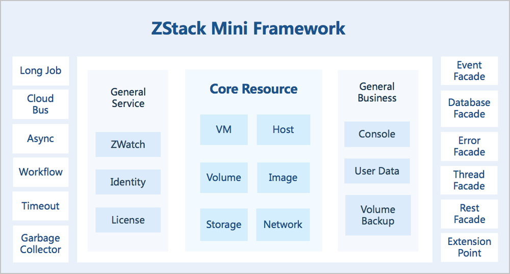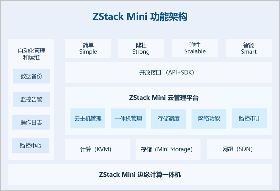 ZStack Mini继承了ZStack的4S架构优势(即:简单Simple、健壮Strong、弹性Scalable、智能Smart),使用消息总线与数据库及各服务模块进行通信,提供更轻量灵活的云主机管理、一体机管理、存储调度、网络功能、监控审计等功能。ZStack Mini也提供了标准的API和SDK,支持RESTful APIs进行资源调度管理,方便后期对用户业务进行深度对接和集成。
