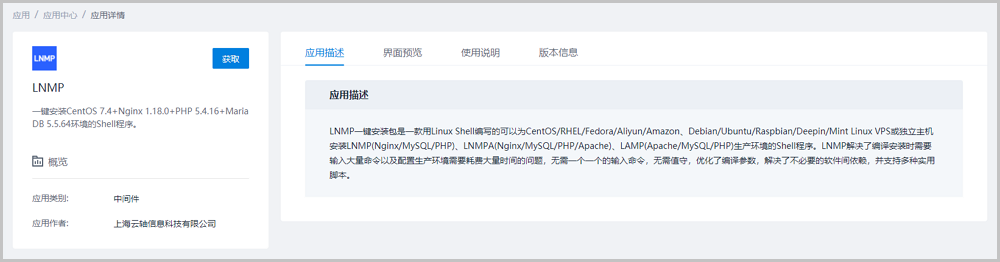 | LNMP | 中间件 | LNMP一键安装包是一款用Linux Shell编写的可以为CentOS/RHEL/Fedora/Aliyun/Amazon、Debian/Ubuntu/Raspbian/Deepin/Mint Linux VPS或独立主机安装LNMP(Nginx/MySQL/PHP)、LNMPA(Nginx/MySQL/PHP/Apache)、LAMP(Apache/MySQL/PHP)生产环境的Shell程序。LNMP解决了编译安装时需要输入大量命令以及配置生产环境需要耗费大量时间的问题,无需一个一个的输入命令,无需值守,优化了编译参数,解决了不必要的软件间依赖,并支持多种实用脚本。 |