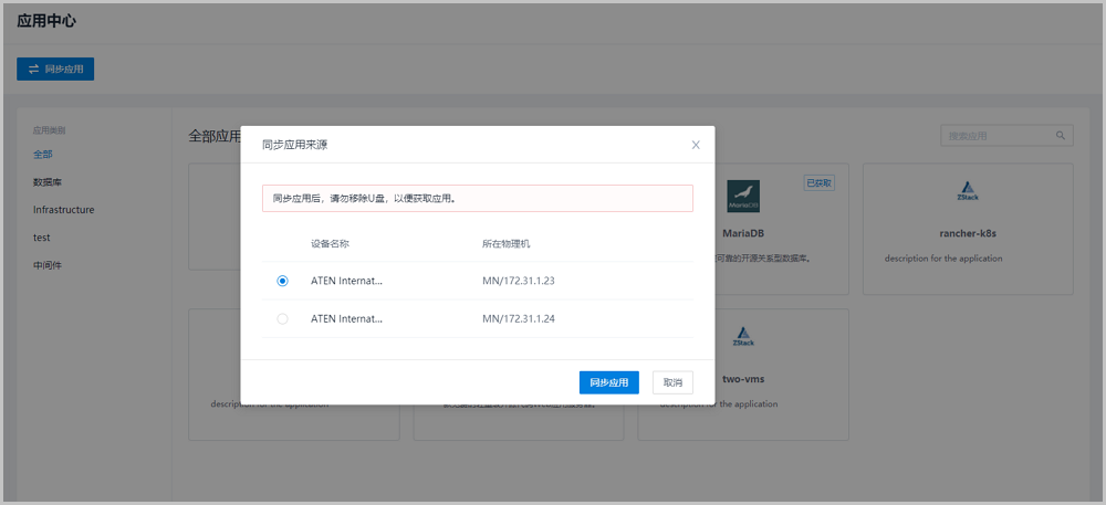 用户需要部署一套最新的ZStack Mini环境,并将包含应用的U盘设备连接至一体机管理节点。