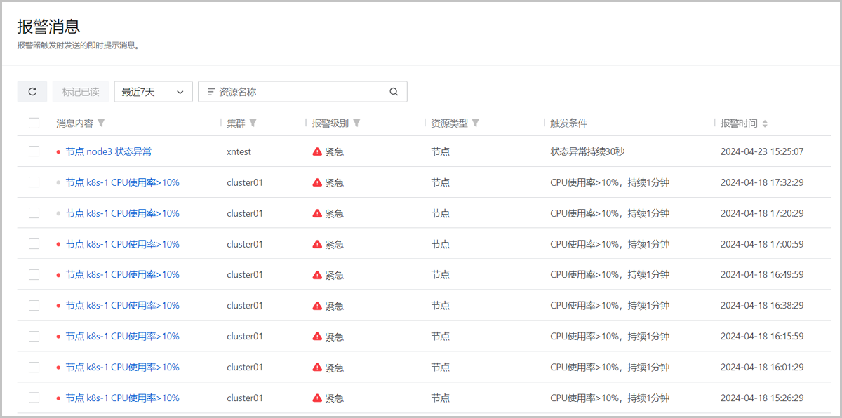 该页面集中展示所有报警消息,包括报警消息的消息内容、报警级别、资源类型、触发条件、报警时间等。