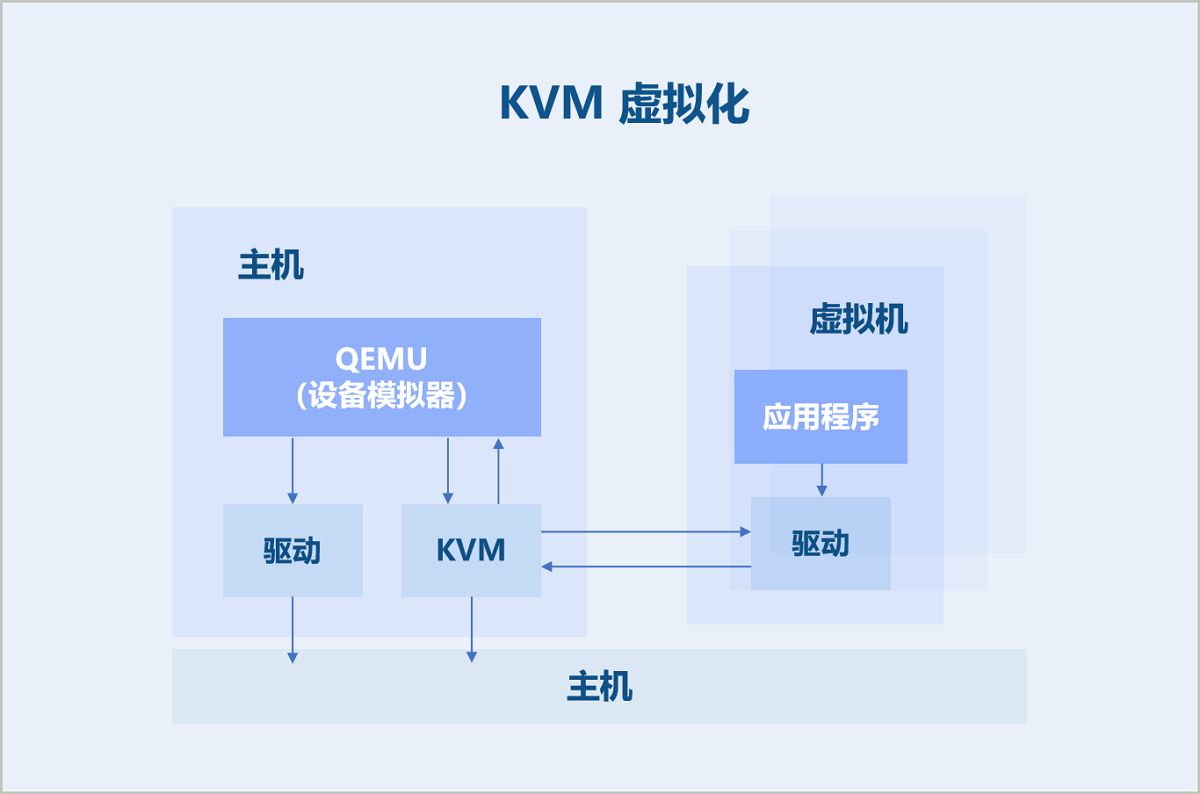 ZStack ZSphere支持采用基于KVM的硬件虚拟化技术。KVM是一个Linux内核模块,将Linux内核变成一个Hypervisor。KVM在Linux系统内以进程形式出现,由标准Linux调度程序进行调度,因此KVM能够使用Linux内核已有功能,例如:内存管理、CPU调度等。但是,KVM本身仅提供CPU与内存虚拟化,I/O设备虚拟化需结合Qemu才能完成。Qemu是一个用户态的设备模拟器,为虚拟机提供虚拟设备模型,负责各种虚拟设备的创建、调用及管理。